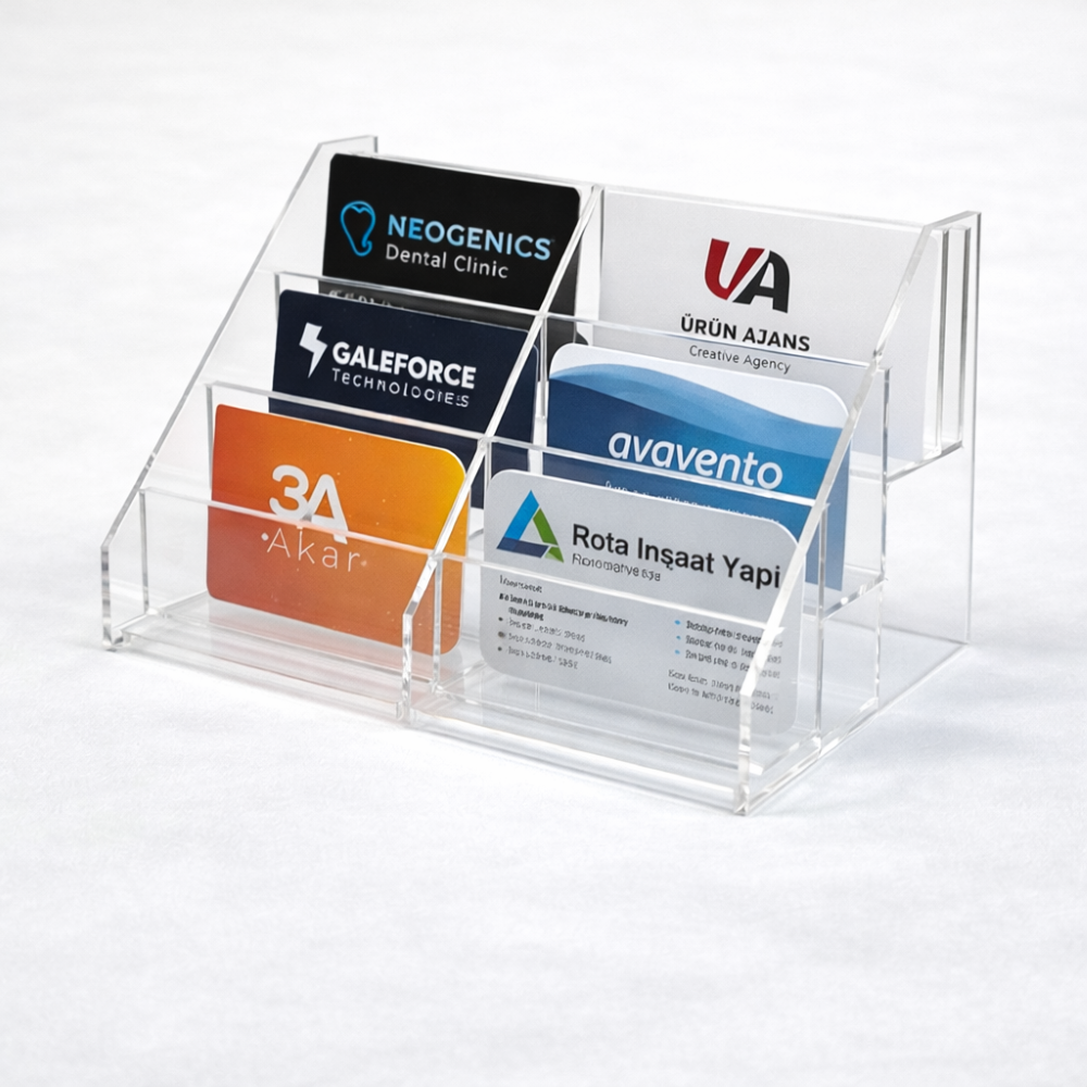 Ofis, mağaza veya danışma noktalarında profesyonel bir sunum için oldukça kullanışlıdır. Kartvizitlerinizi tek tek dağıtmak yerine düzenli şekilde sergileyerek markanızın kurumsal imajını güçlendirebilirsiniz.