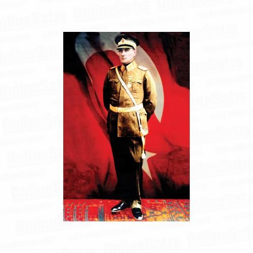 Dış mekan ve iç mekan kullanıma uygun raşel kumaş üzerine dispers boyalarla Atatürk fotoğrafı baskısı. Atatürk posterlerinde kullandığımız dispers boyalar sublimasyon boyaya göre daha uzun süre solmayan, yağmurda akmayan ve insan sağlığına zararı olmayan boyalardır.