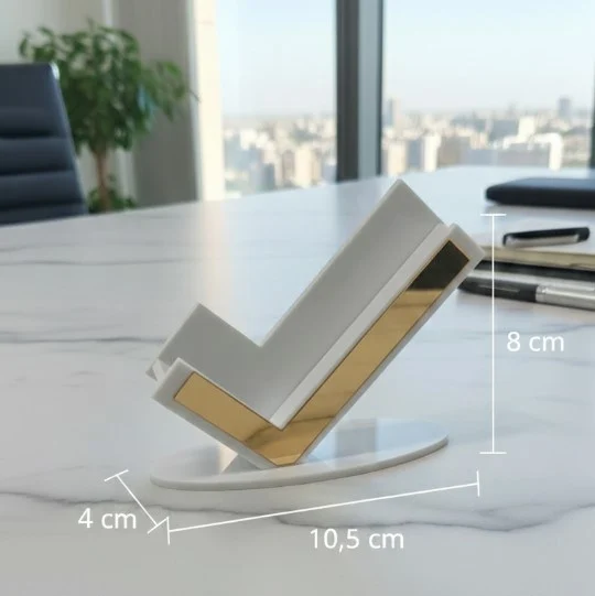 Modern hatlara sahip tasarımı sayesinde çalışma alanına zarif bir dokunuş katan bu model, kartvizitlerin düzenli şekilde sergilenmesine yardımcı olur. Beyaz gövde üzerine uygulanan gold detaylar, ürüne daha premium bir görünüm kazandırırken masa üzerinde profesyonel bir duruş oluşturur. Hem kişisel kullanım hem de kurumsal hediye seçeneği olarak değerlendirilebilecek şık bir üründür.