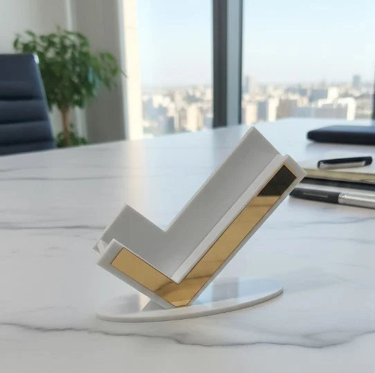 Beyaz Gold Detaylı Premium Kartvizit Standı, sade ofis dekorasyonuna uyum sağlayan ama sıradan görünmeyen bir masaüstü üründür. Beyaz yüzeyin temiz görünümü ile gold detayların premium etkisi birleşerek kartvizit sunumunu daha dikkat çekici hale getirir. Kartvizitlerin düzenli durmasını sağlar ve masa üzerinde prestijli bir görünüm oluşturur.