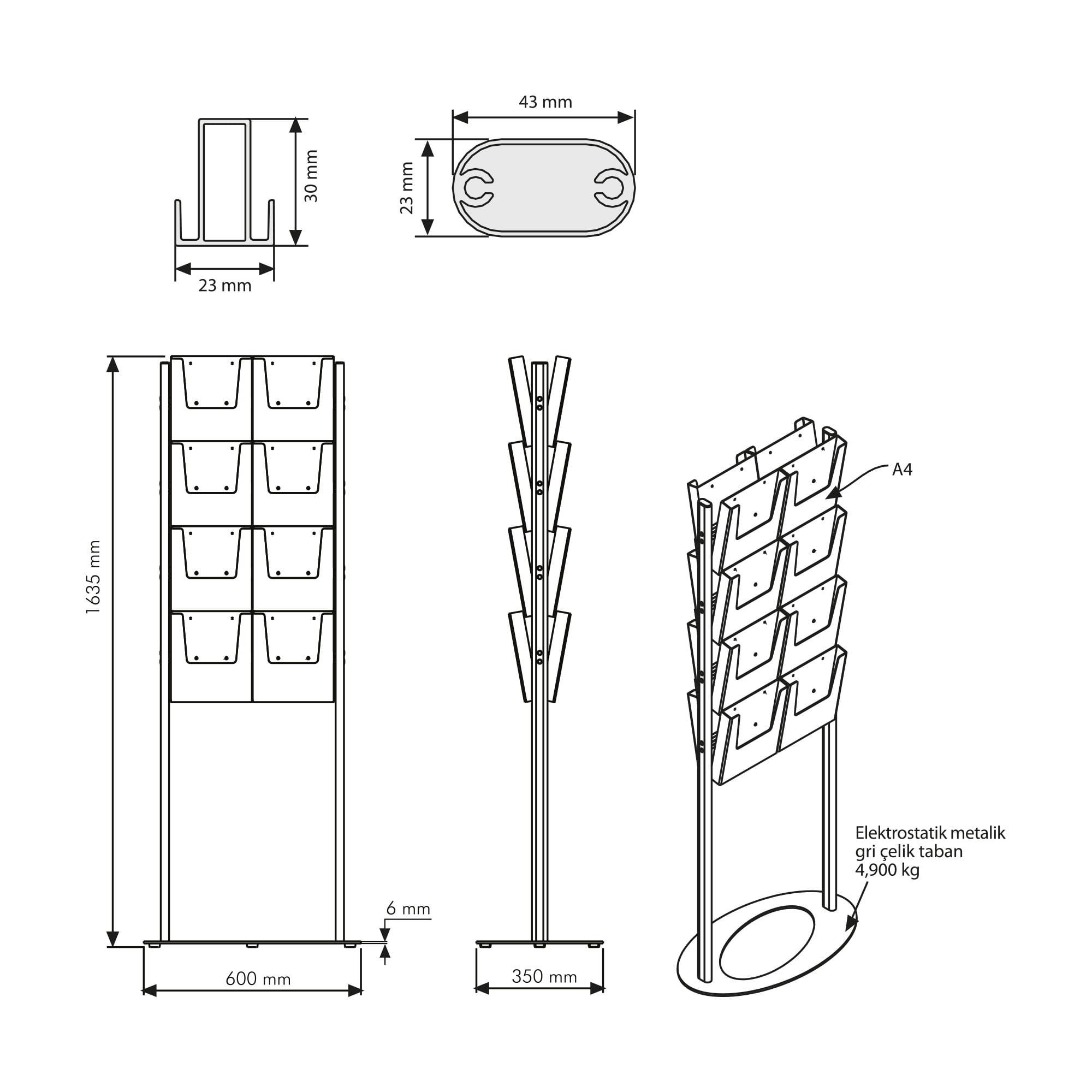 - Ayaklı Coctail Broşürlük 2×4 A4 modeli sayesinde stant içinde kolayca konumlandırma yapabilirsiniz