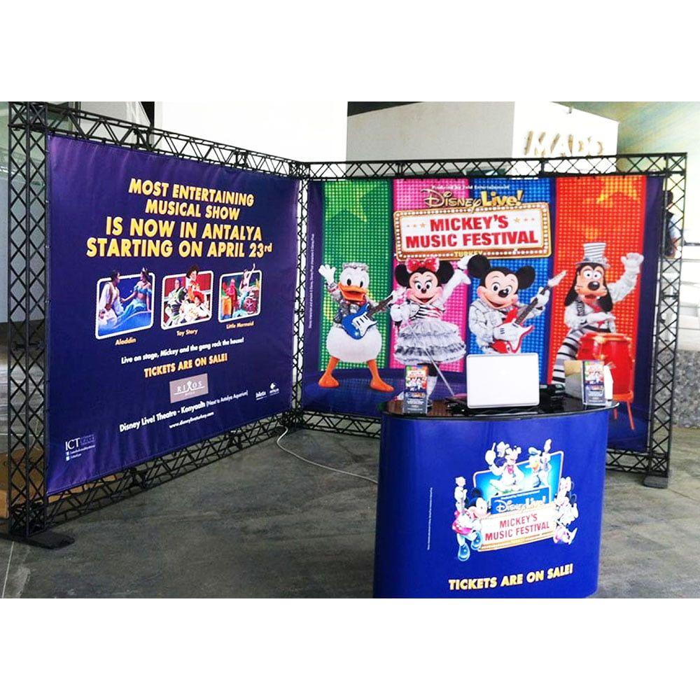 - Crown Truss L Model Portatif Stand 3×3, konferans girişlerinde bilgilendirme masası veya sponsor alanı olarak