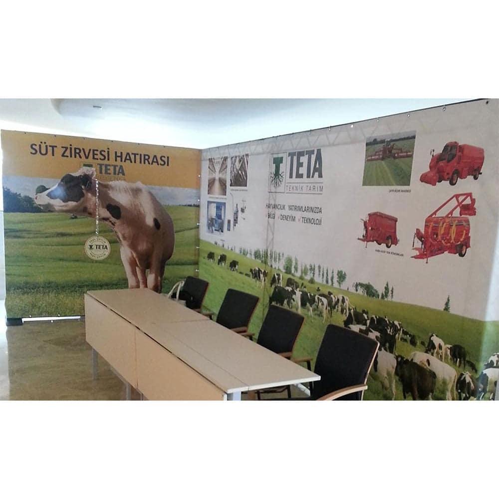 Standın 📐 270×210 cm ölçülerindeki 2 adet geniş banner alanı, markanızı etkileyici bir şekilde sergilemenizi sağlar. 🖇️ Baskılar asılarak monte edildiği için değişimi oldukça pratiktir.