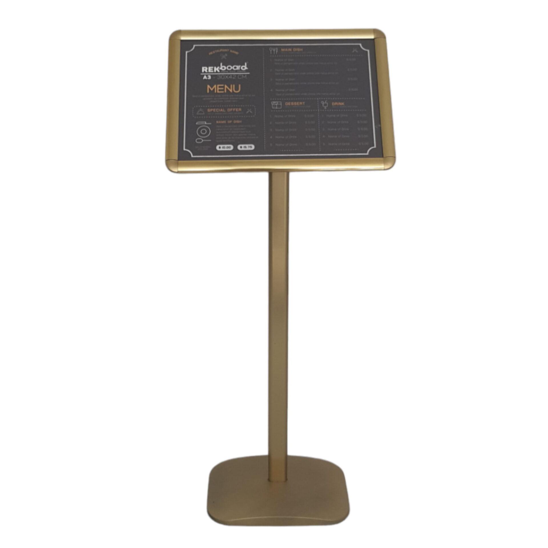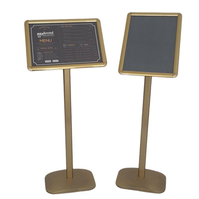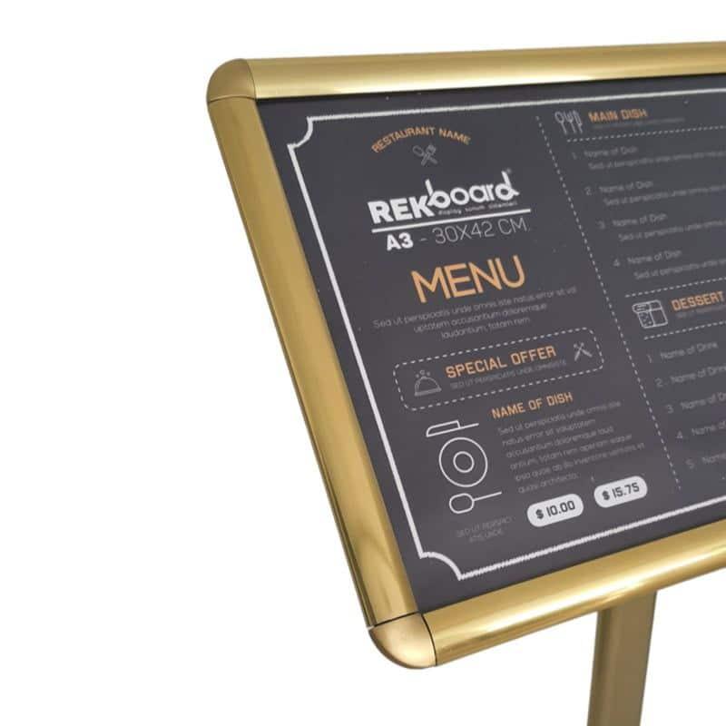 Ayaklı A3 Gold Menü Tabelası konuklarınıza lüks bir deneyim sunar. Aynı zamanda, demonte yapısı kolay taşınabilirlik sağlar.