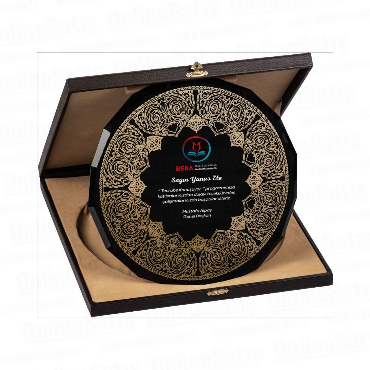 - **Özgün Tasarım:** Yuvarlak cam tabak yapısı, geleneksel dikdörtgen plaketlere modern ve farklı bir alternatif sunar.