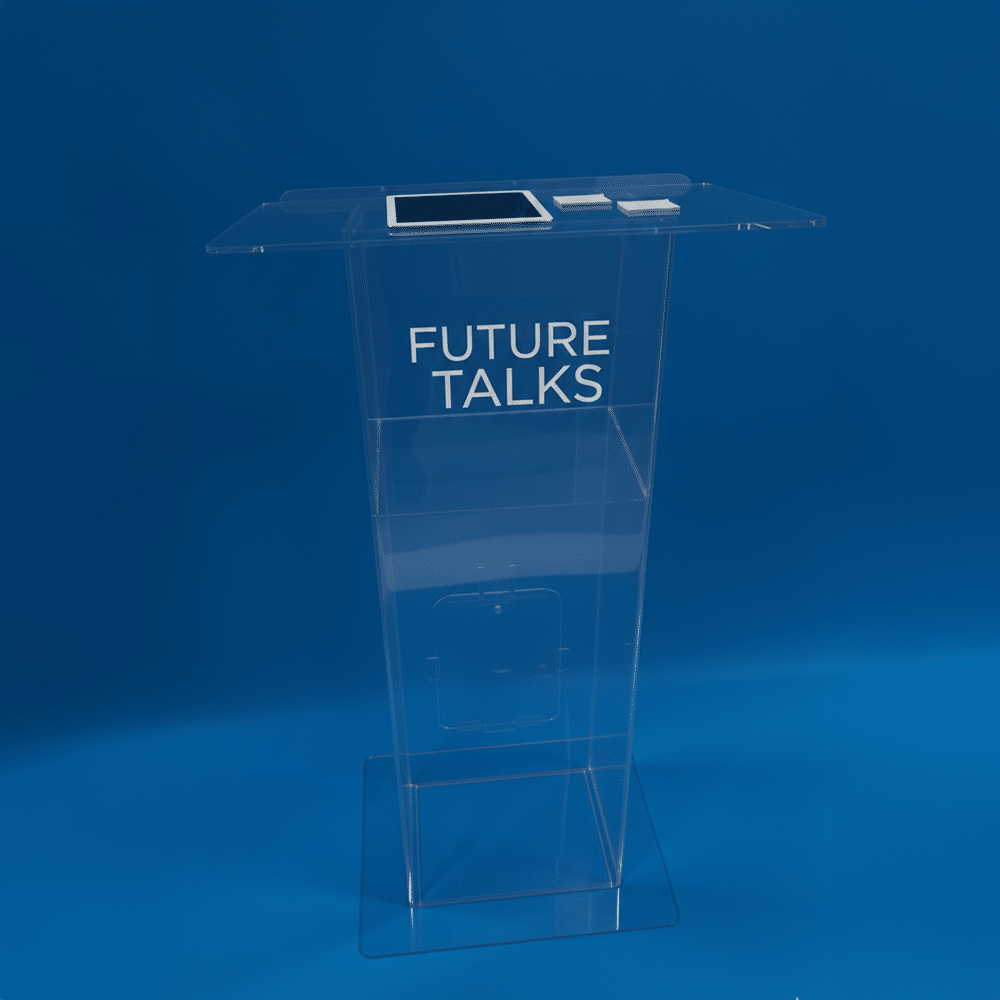 Minimal çizgileriyle öne çıkan şeffaf kürsü modeli, konferans salonlarından otellere, üniversitelerden belediye salonlarına kadar geniş bir kullanım alanına sahiptir. 🏛️