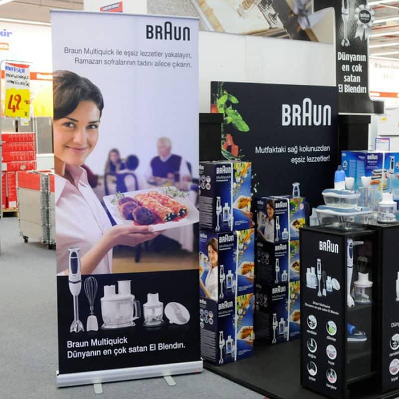 - Kurulum: Mekanizmayı zemine yerleştirin ve bannerı yukarı çekin. Kurulum işlemi, birkaç saniye içinde tamamlanır.