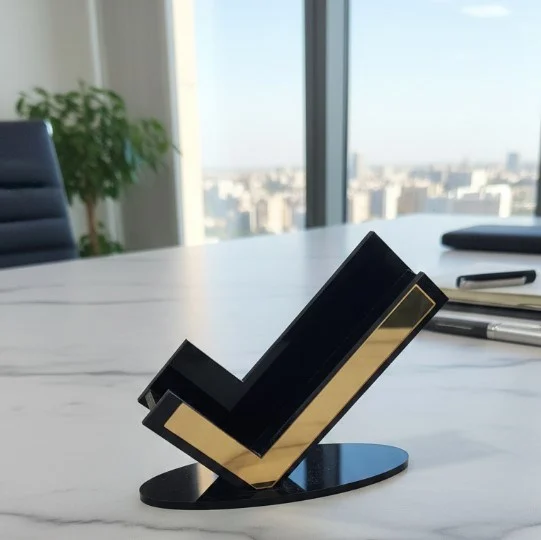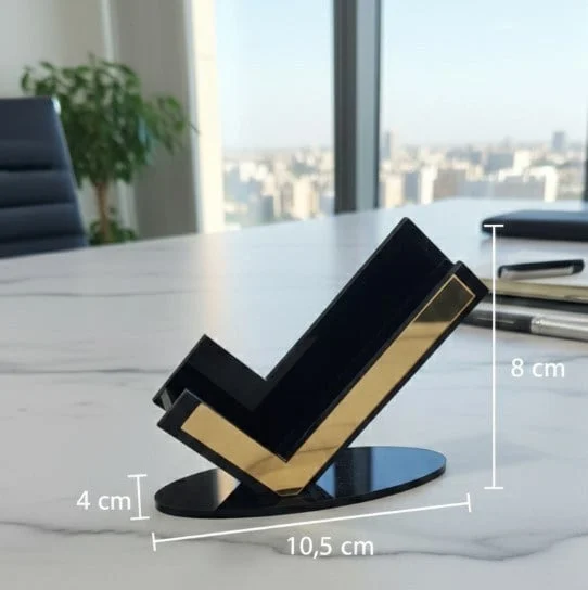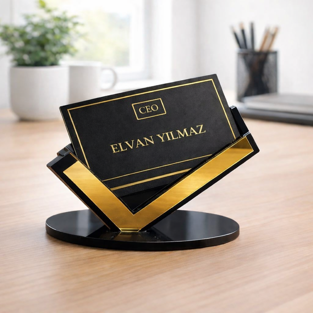 Siyah Gold Detaylı Premium Kartvizitlik, masaüstünde düzen ve prestiji bir araya getiren şık bir kartvizitlik modelidir. Siyah ve gold akrilik malzemeden üretilen bu özel tasarım ürün, modern çizgileri ve dikkat çekici görünümüyle çalışma alanlarına güçlü bir duruş kazandırır. Özellikle yönetici masaları, resepsiyon alanları, danışma noktaları ve kurumsal ofislerde profesyonel bir sunum oluşturur.