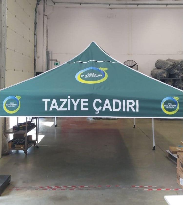 Taziye çadırları üst tavan kısmının saçağına (etek) veya tamamına logo baskı yapılarak kullanım. Dilerseniz duvar kısımlarına da dilenen her türlü baskı mümkün.