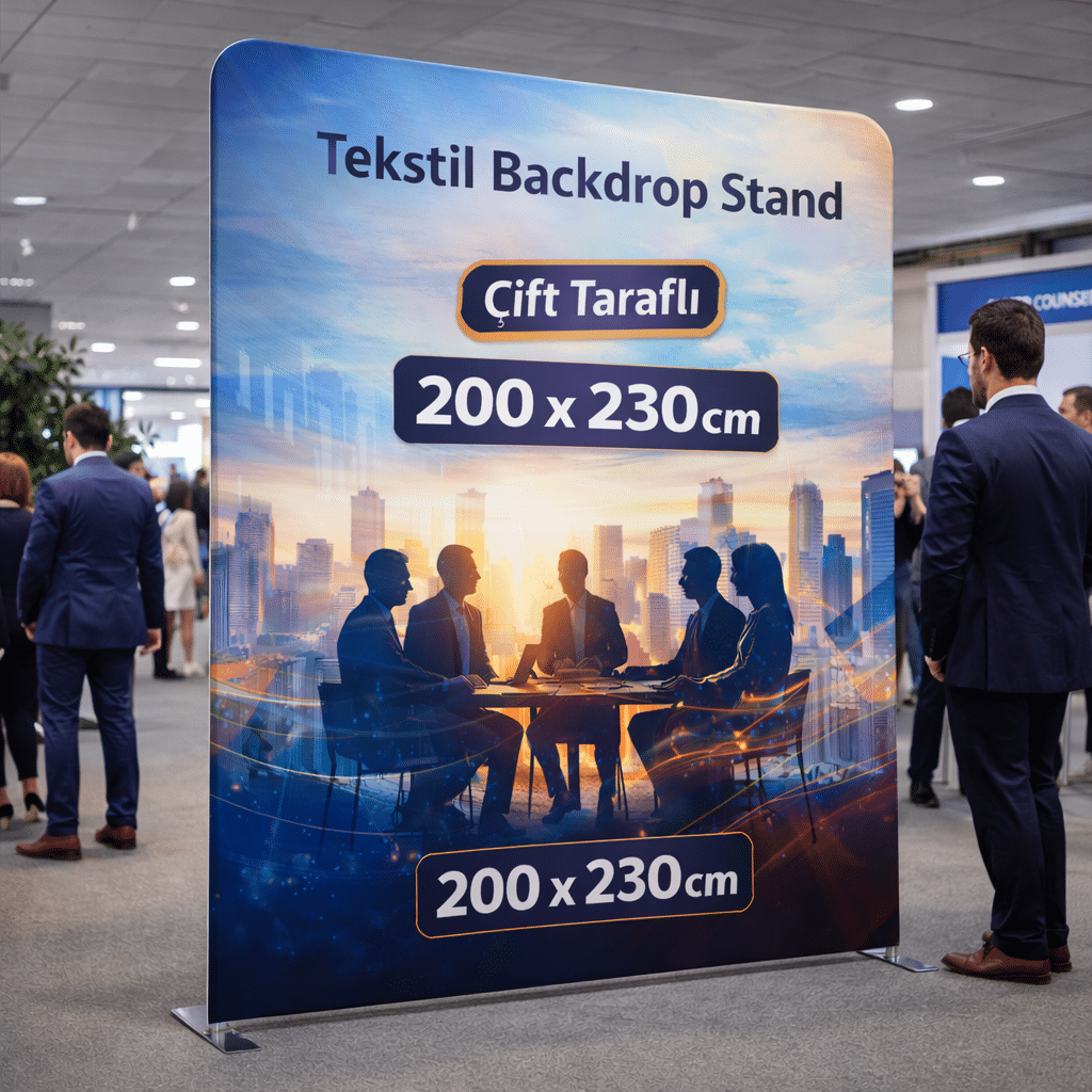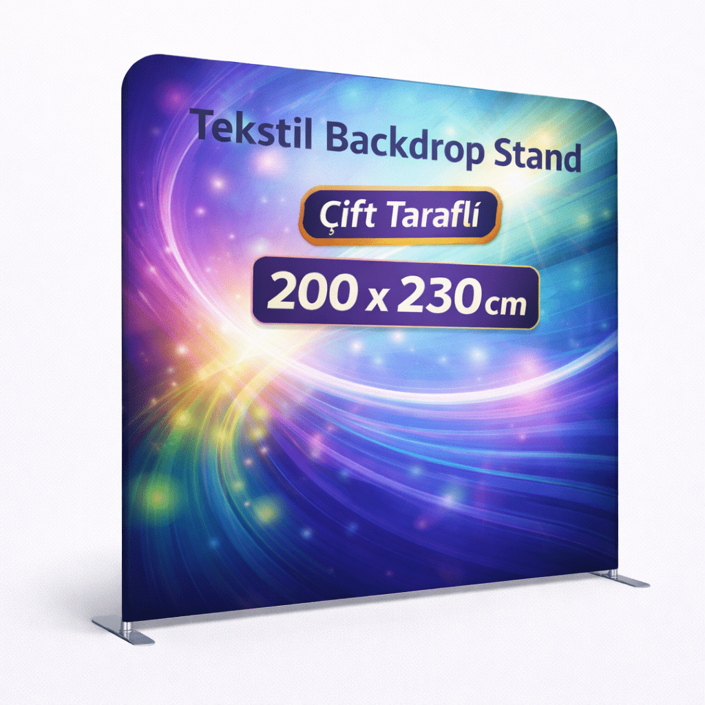 Tekstil Backdrop Stand 200x230cm Düz, daha yüksek ve etkileyici bir görsel alan isteyen markalar için tasarlanmış profesyonel bir tanıtım sistemidir. Özellikle fuar, lansman, sahne arkası ve etkinlik alanlarında markanın daha net ve güçlü algılanmasını sağlar. Düz formu sayesinde görseller bozulmadan, tek parça ve gergin bir yüzey üzerinde sergilenir.
