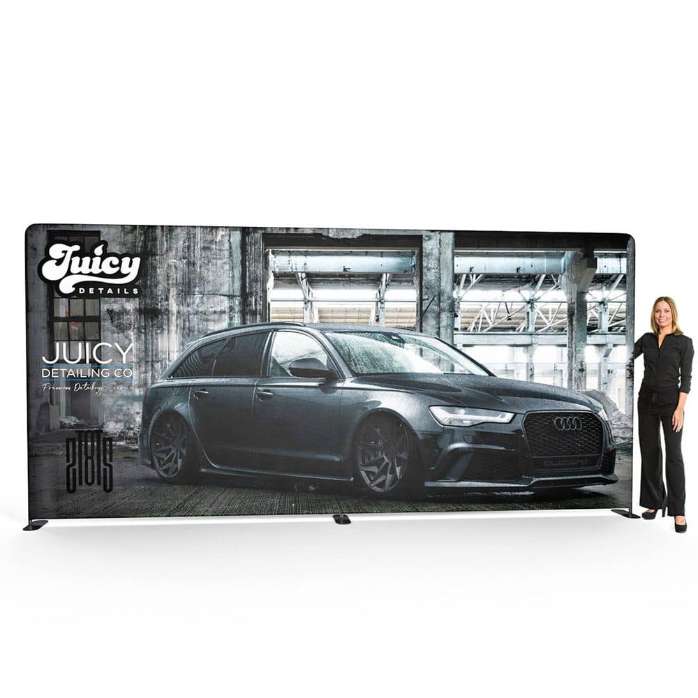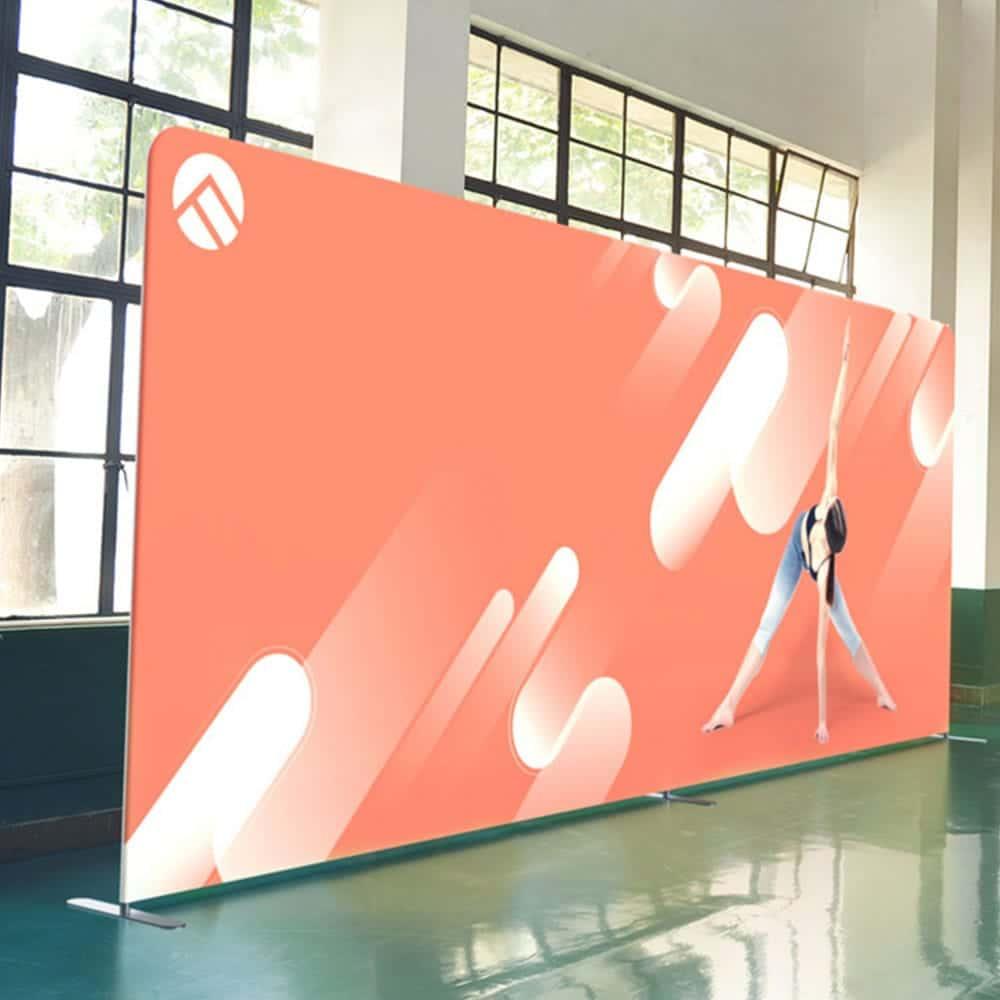Aletsiz montaj sistemiyle portatif kumaş fuar standı 550x250cm Düz, ortalama 5–10 dakikada kullanıma hazır hale gelir.