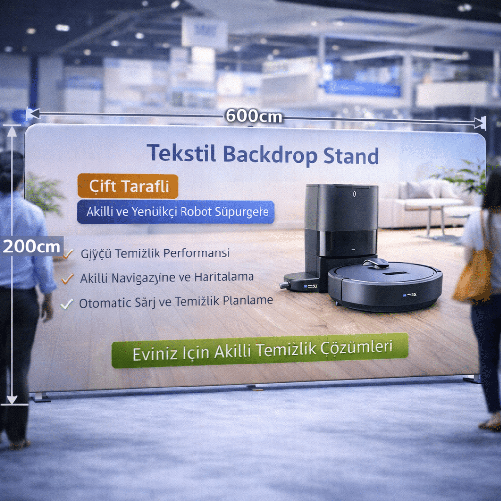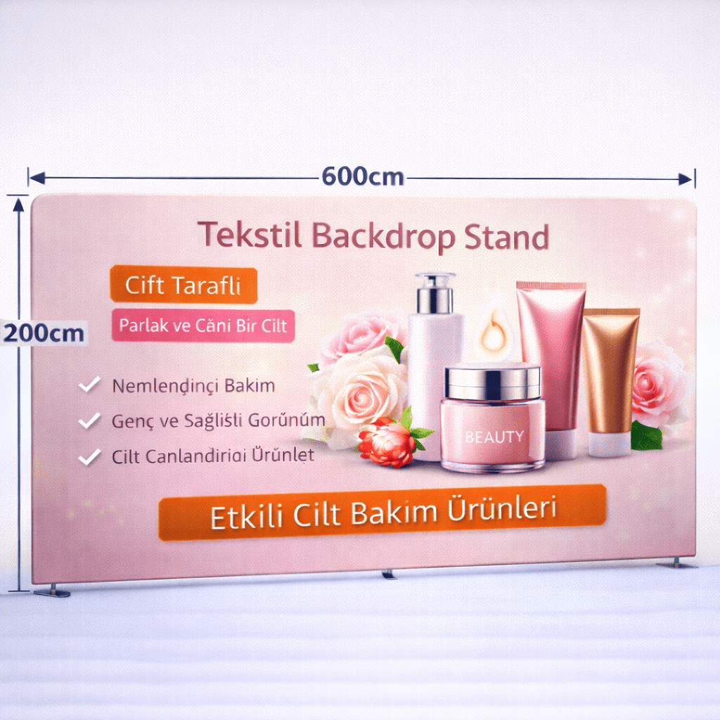 Uzun ve geniş alanlarda kesintisiz bir marka anlatımı oluşturmak isteyenler için 🌍 Tekstil Backdrop Stand 600x200cm Düz, yatay genişliğiyle fark yaratan profesyonel bir sunum çözümüdür. Özellikle büyük fuar stantları, lansman alanları ve sahne arkalarında, tek parça ve bütüncül bir görsel etki sağlar. 🎯