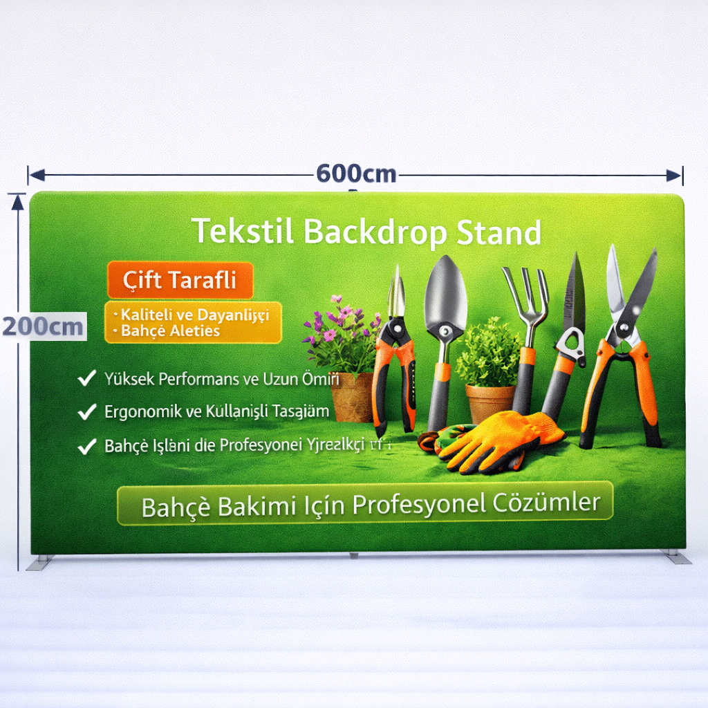 Tekstil Backdrop Stand 600x200cm Düz, uzun ölçüsüyle büyük alanlarda maksimum görünürlük sağlar. Pratik kurulumu, taşınabilir yapısı ve net baskı kalitesi sayesinde profesyonel organizasyonların vazgeçilmez çözümlerinden biridir.