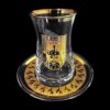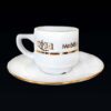 Kahve Fincanına, tabağına yaldız deseni, ‘LOGOLU’ yazısı ve kahve desenlerinin tamamı el işçiliği ile desenlenmiş olup kumlama tekniği kullanılarak cam aşındırılmıştır.